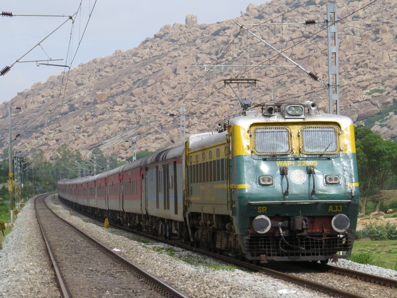 The Yeswantpur - Kamakhya AC Express led by grand daddy Arrakonam WAP-1 #22005 basks in the sunlight near the rocks at Tyakal. (Shishir Jairam)