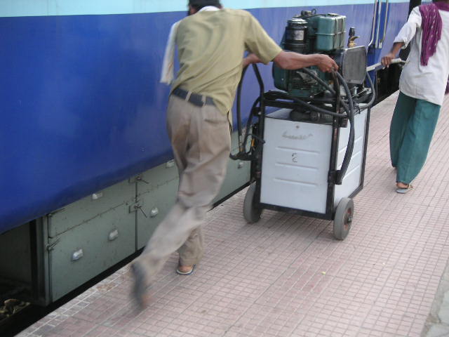 Phenyl being sprayed into the toilets by mobile machine. Is this service limited to only AC cars?. Ballarshah, 02/07/2004. By Ashit Chakraborty.