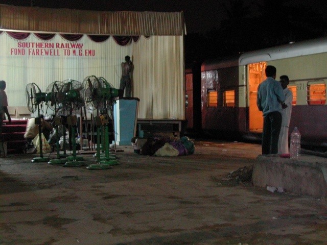 Preparations are on for the July 1st special run while a rake waits for its final run to start. MS, 2004-06-30. By Gautam.
