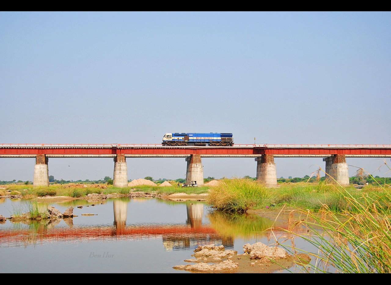 A WDG-4 class loco from Hubli trundles over one of the two rail bridges over river Tungabhadra towards Raichur, from Manthralayam Road (BenHur)