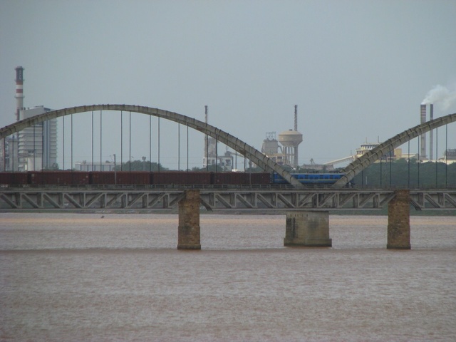 A WAG-7 hauling a goods rake towards Godavari station as seen from the old Godavari rail-cum-road bridge. In the background is the famous paper mill of Rajahmundry.