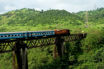 Aurangabad bound Jan Shatabdi rushes past the green velvet of Thull ghats. ()