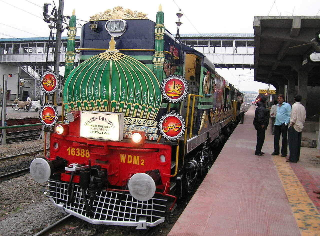 Dargah at Secunderabad or DOW - Dargah on Wheels!!! MLY WDM2 16388 decorated like a Dargah for hauling Halkatta special for 30th URS-E-QUADEERI being brought in from MLY and moving towards Hyderabad. Short hood was decorated like Dargah, both sides of short hood had brass eagles welded and bolted, both sides of cabin had facing brass sharks again welded and bolted, side of long hood had a big hoarding in Urdu, brass swans adorned railings of side walks and Long hood had a crown like thing placed on side walk, Secunderabad Jn.