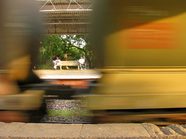 Daily commuters wait for the 1705 clockwise EMU service at Saojini Nagar, while a BTPN rake shattered the silence moving towards Okhla. (Ankit Bharaj)