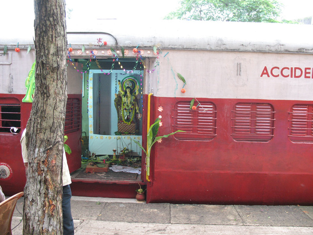 Very auspicious moment, a sacred puja is carried out by the IR employees inside an accident relief van. May God bless IR. ()