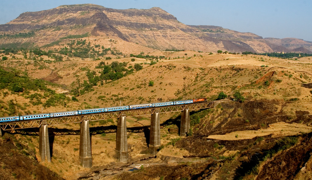 Aurangabad bound Jan Shatabdi express crosses a viaduct on Thull ghats.The PAGODAS of Vipassana International Centre for Meditation can be seen on extreme right. Igatpuri,India.Picture taken from the terrace of Ganaka Motel. ()
