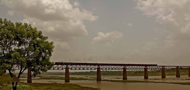 The Ratlam-Indore-Khandwa-Akola passenger glides smoothly over the majestic Narmada river before Omkareshwar road with customary Mhow YDM 4 #6736 incharge. Photo taken near the Gopal Midway treat restaurant next to the road bridge. (Sid)