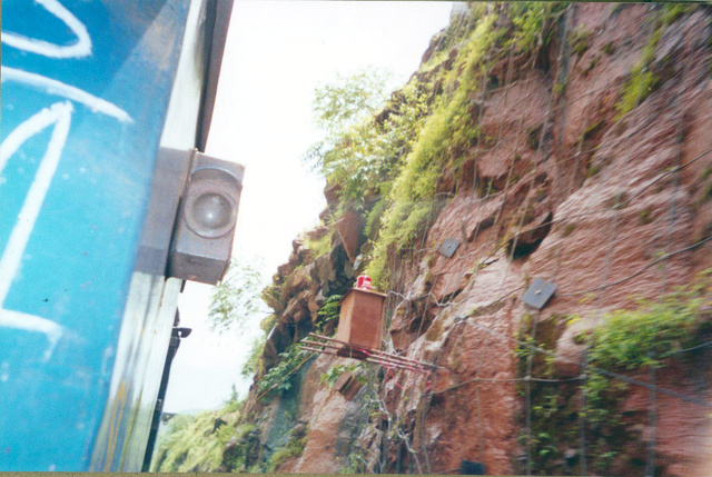 The alarm is coonected to a string that runs along the laterite rocks, alongside the track. It is activated by movement. In addition to the siren and flashing lights, its seemed to have the facility to alert the nearest observation post through a radio signal. I also saw solar powered panels to energise the entire system. Near Khed, Konkan Railway, August, 2004. By Landslide Alarm On Konkan Railway..