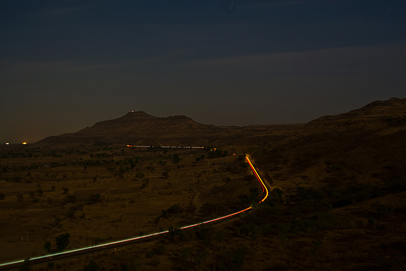 A light trail of the Kolhapur bound Mahalaxmi express taken on a full moon night at Shindawane.The yellow streak is the headlight of the loco & the red light is the tail lamp.If looked closely,one can also see the star trails.Image taken at 00:30 hours.()