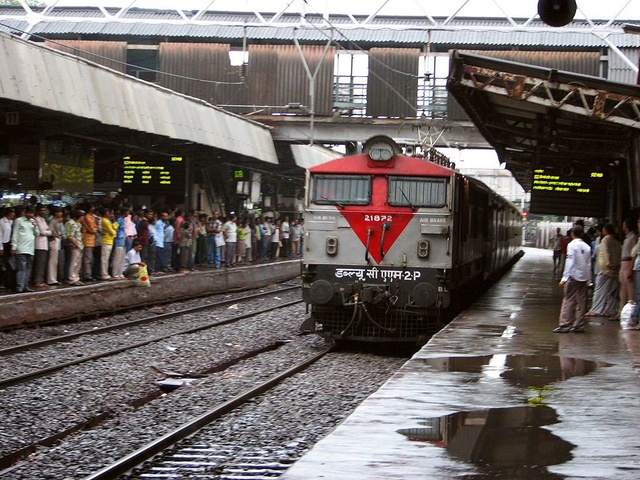 The Karnavati Express from Ahmedabad screams through a wet Dadar station as passengers wait for the 1249 fast to Churchgate. Mumbai (WR), 2005-09-052005. Shashanka Nanda.