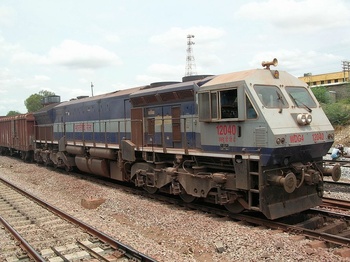 Ashok Leyland truck standing along with WDP4 20025 and both of these belong of Govt. of India and Indian Railways. WDP4 20025 has got a roof mounted Air Conditioning unit. Bangalore City Jn., 2005 05 15. Pavan Kumar.