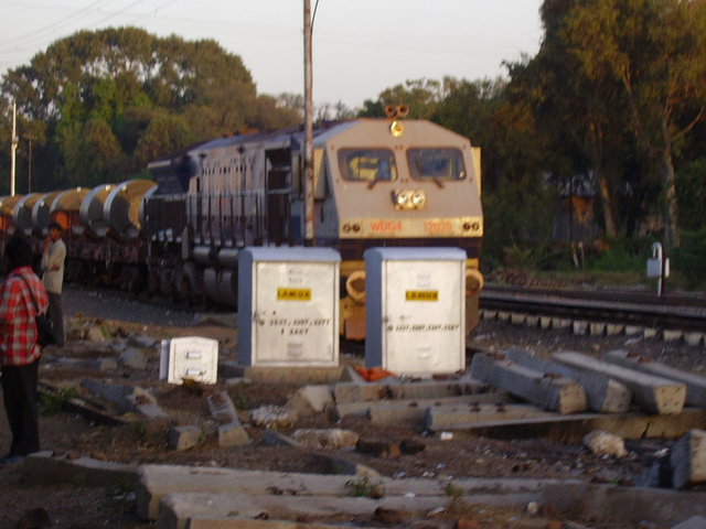 WDG4 #12035 waiting at Daund to proceed towards Pune in fading evening light. Daund, 2005-02-22. By .asHIsh.