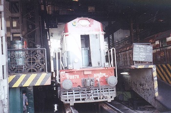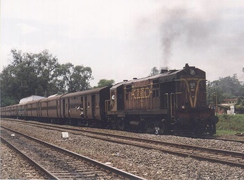 Two Pune WDM-2s shunt the Goa Exp. The loco on the left shows the new bogie-mounted sandboxes; the right loco has the older hood-mounted sandboxes (not visible). However, the loco on the left still has the open port in the hood for filling sand in the old