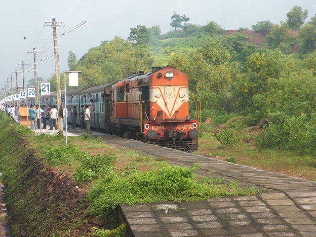 WDM2 #16295 from Ernakulam hauling the 6337 Okha - Ernakulam Express waiting for our train at Thivim.