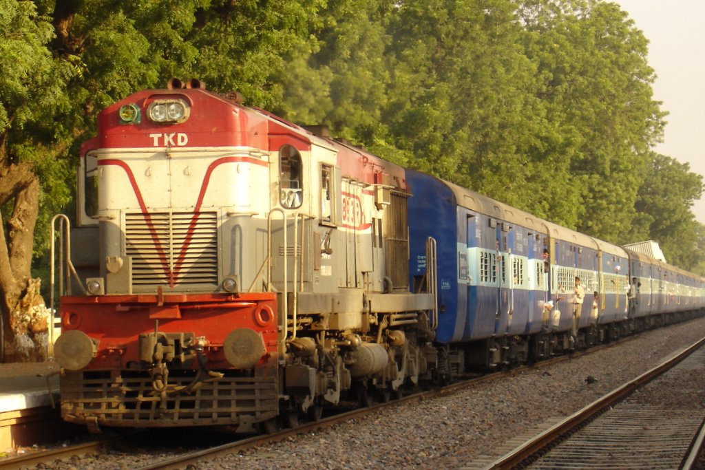 Early morning sunlight reflects off a TKD WDM3a in charge of the Jammu-Jaipur express