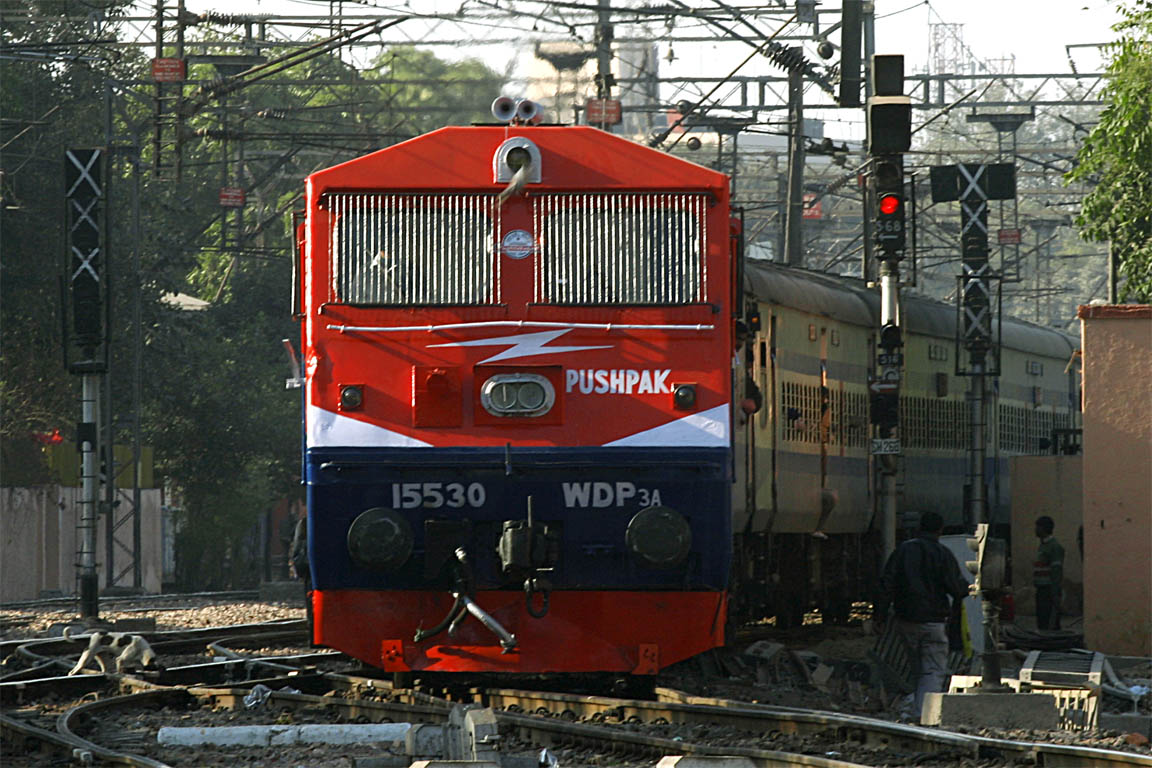 Tughlakabad's decked up WDP3A #15530 Pushpak starts from New Delhi with the Shalimar Express to Jammu. It was the first commercial run for this loco after its repaint. Thanks to JD and SS for the tip off.