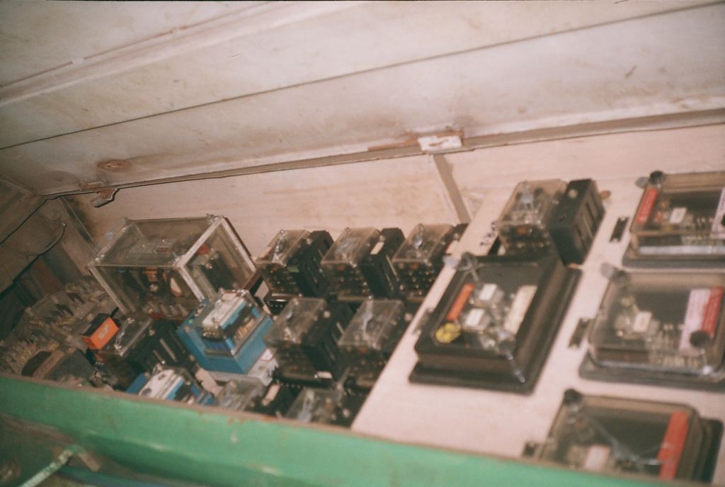 Various timing, control, and interlocking relays behind the assistant driver's seat in a non-microprocessor-controlled WAP-4 loco. Bhusaval, August 2005, Khalid Kagzi.