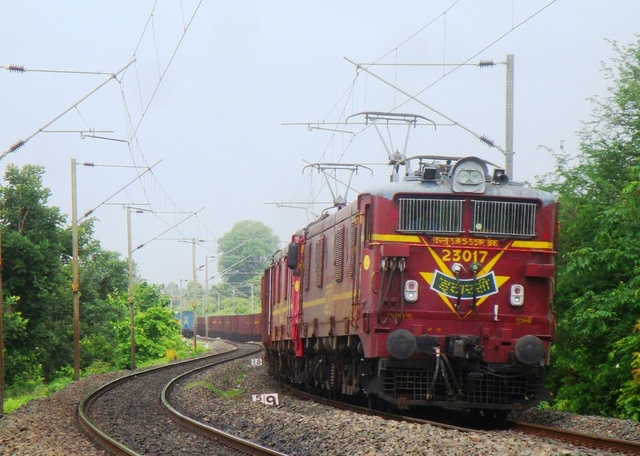 ET WAG 5A duo headed by #23017 leads an empty BOXN rake down the Bhadbhada ghats. The train disappearing around the curve is the 1058 ASR-DR Express. (Ujjawal Kashyap)
