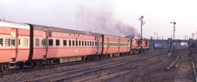 Active blast from the past: the double YDM-4-headed Pink City Express leaving Jaipur. Note decorative arch cutouts fitted on the car doors. #AUTH1#John Lacey#AUTH2#. #GOLD#