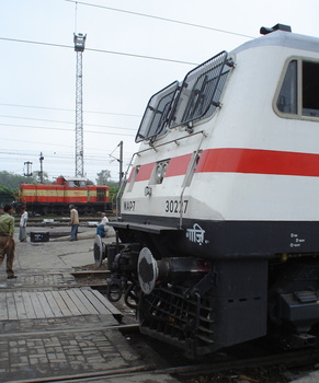 A puny shunting engine, yet, this terrific capture of a WDS6 at Ernakulam by Jimmy Jose does give an impression of raw power, especially with the engine banking to one side! Bravo! (2005) #AUTH1#Jimmy Jose#AUTH2# #MENTION#.