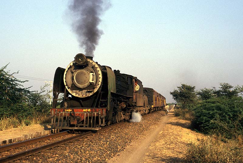 YP 2684 on fast passenger 332 Dhola Junction - Jetalsar. As we were footplating the engine, we could just phot it during stops. Loco staff were especially proud of their time-keeping and perfectly running YP. Just after this shot was taken, 95 kph were reached on the next section, proving the capability of steam traction even in its last days ! This was just one of the best and most terrific thrash I've ever seen on the footplate of a steam locomotive, and it is with a slight legs-shaking that we left the friendly crew at Jetpur! December 1997 - Alexandre Gillieron.