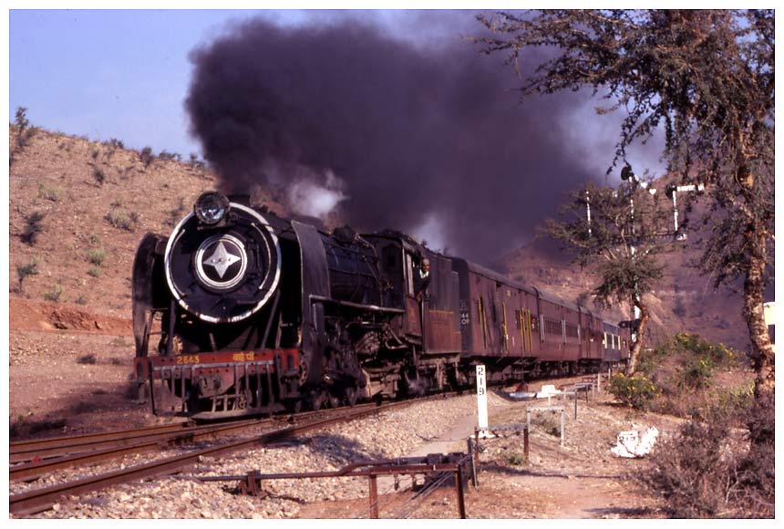 YP -2643 charges uphill and through the loop with # 85 Mewar Pass. Kharwachanda, 1982-01-03. By Wp7713.