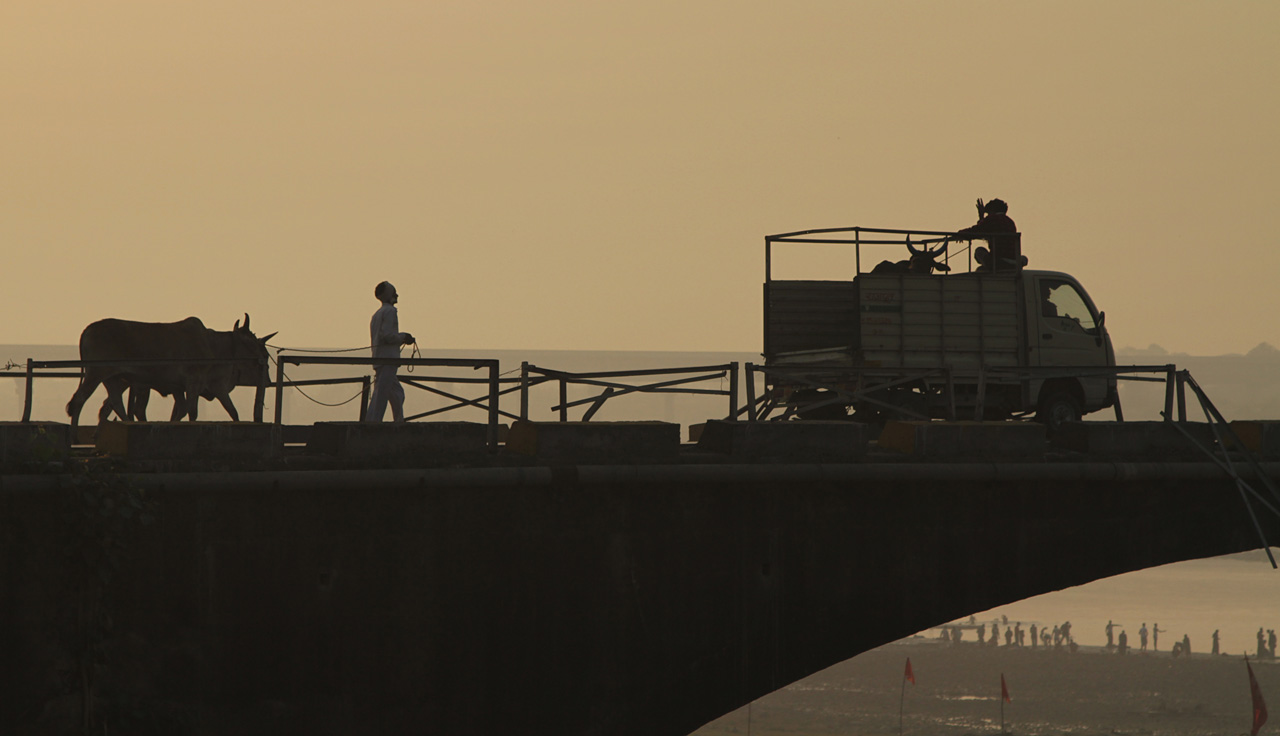 Narmada River, Omkareshwar Road: Old fashioned cow vs. motorized cow, 2012-02-13 (Roni Kappel)