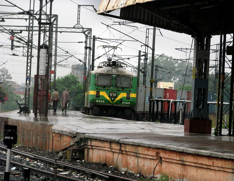 LGD WAG-9 #31149 leading a Conraj takes a curve into platform #6 of Ratlam from BRC side on a rainy morning. (Parthajit Dasgupta)
