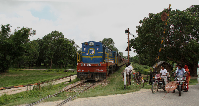 The level crossing is manually managed and closed by merely a chain. The pole visible is just for show and is not functional or rather malfunctions (Trayambak Ojha)