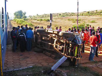 A couple of Kms before Koraput, our train came to halt and intensity of braking was such that it made us curious and upon reaching the loco, we found this - Our train had hit a bolero at unmanned LC, no causality thankfully!! (Ankit Bharaj)