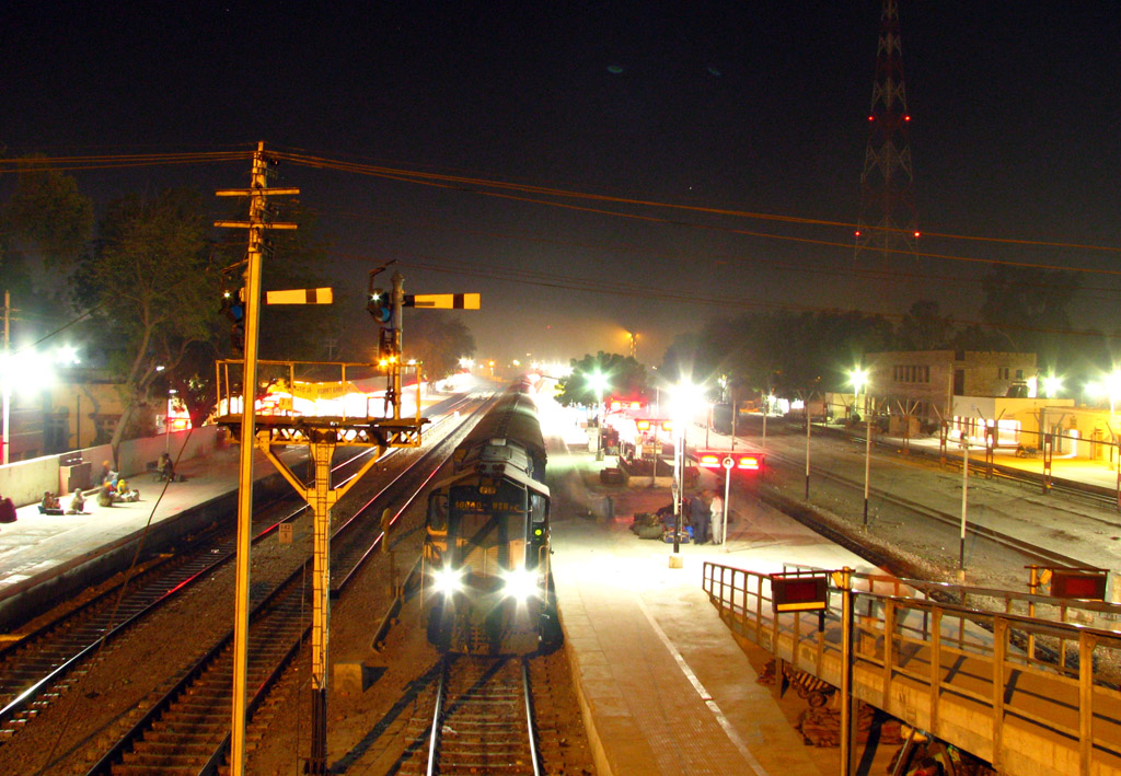 Suratgarh station at night. MG is on right side while BG is on left side. The train standing right now is 4888 Barmer-Kalka/Haridwar express led by ABR WDM-2A #16840. (Samar)