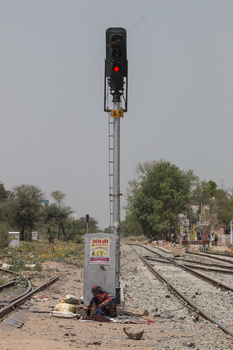 Sikar is also due to become a BG-MG junction. The conversion of the Loharu - Sikar line is complete and commercial traffic is due to open soon. Here a local vendor sells Rudraksh beads underneath the BG starter signal. (Shashanka Nanda)