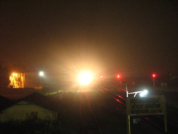 The day begins with the blessings from the halo of the diesel god UBL WDG-4 as it rolls in with a freight from the Arssikere-Kadur side into Birur Junction. Birur. 2010-01-02. (Pawan Koppa)