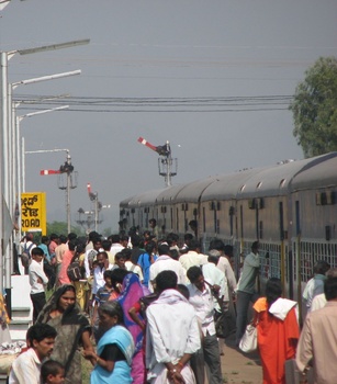Sempahores signal proceed to a light WDG-4 proceeding towards Chikjajur(not seen in the picture) as the platform bustles with people at Hosadurga road, a wayside station between Birur and Chikjajur. Hosadurga Raoad. 2010-01-02. (Pawan Koppa)