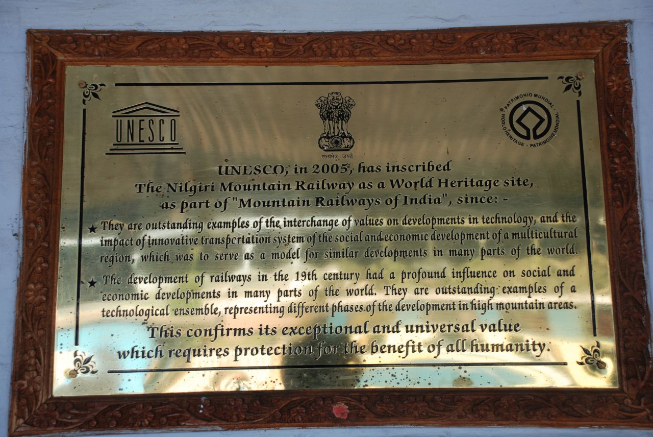 The plaque issued by UNESCO to the Nilgiri Mountain Railway.
