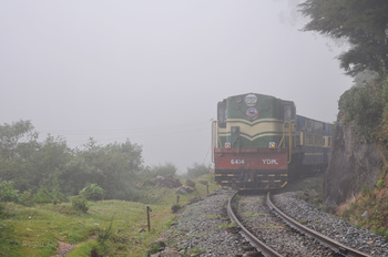 Amidst thick fog, the Coonoor bound passenger led by YDM-4 #6414 pulls into Lovedale. (Naveen M)
