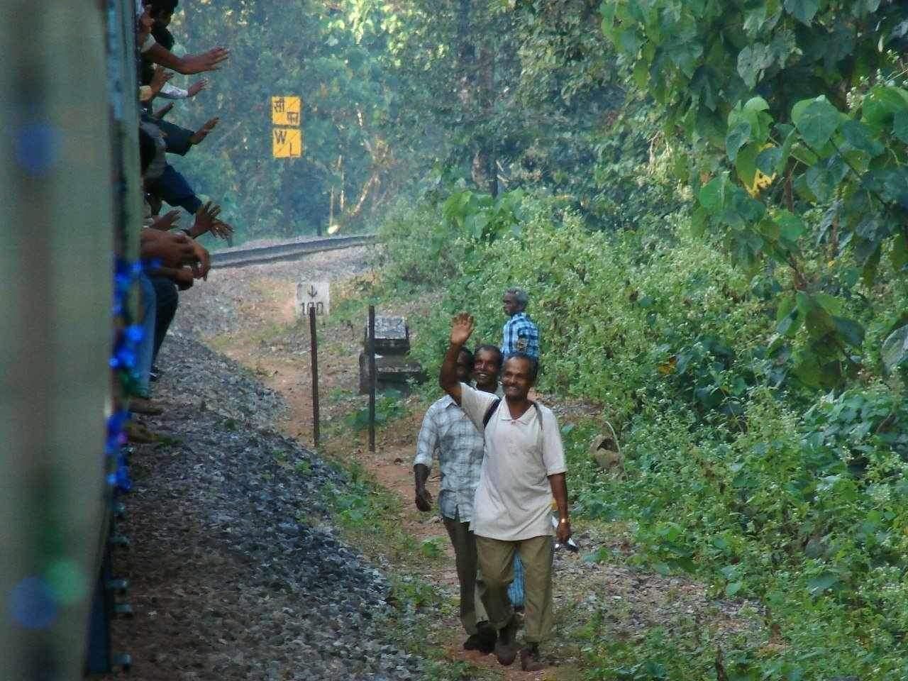 No melancholy ride, this! Very untypical a sight, the entire rake was very lively and cheery despite the early morning and the winter chill. Seen here are a couple of gangmen greeting the passengers and in return, being greeted by scores of enthusiastic passengers. 2007-12-09, Bizzy.