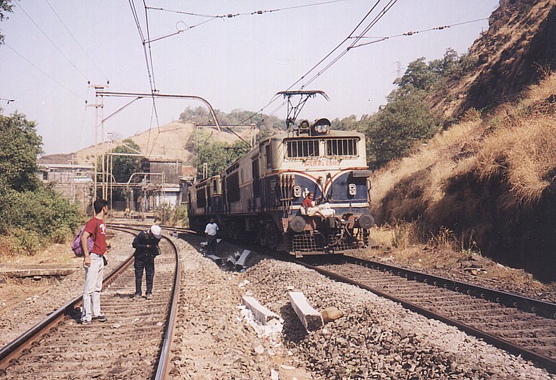 Visible in the pic are from left to right- rail nuts Kesari, Ashish and John. The traction substation near the tunnel #24 (tunnel #3 in this map) is on the right. The Mumbai - Pune road crosses the tracks just ahead. Near tunnel 24 in the Bhore ghats, 2004-14-02. By Apurva (iti@vsnl.com).