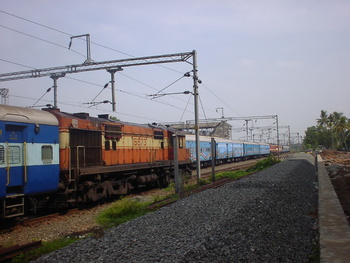 A passenger train behind Ernakulam loco 16857 with an intersted railfan peeping out (any of us?) passes by. Ernakulam, 2004-04-20. By Jimmy Jose.