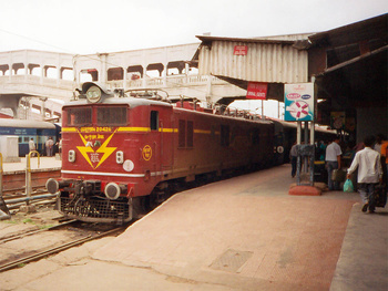 A light Jhansi WAG5HB #24028 starts in the Balharshah direction. Sirpur Kagaznagar, 31/8/2004. By Shashanka.