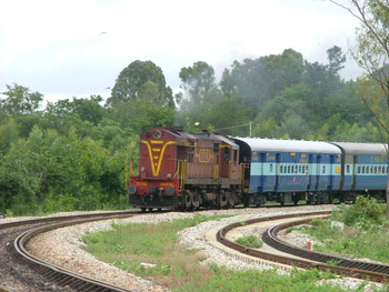 A smokin' gun KJM WDM-2 17176 leads a freight toward YNK with twin GY Shakti's banking the rake. The rake had arrived at YPR with the twin GY's leading and the KJM banking, now it has reversed direction to YNK, where it will again reverse and move to CSDR