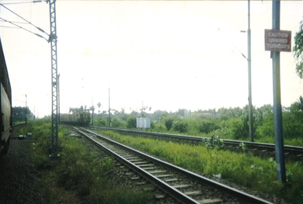 The Nellai Express to Tirunelveli accelerates out of Tambaram station and crosses a Chengalpattu-Tambaram MG EMU. With BG in full "steam" now, the MG lines would soon be uprooted to make this stretch a multi-line BG corridor. The BG EMU service now extends all the way to Kanchipuram. |