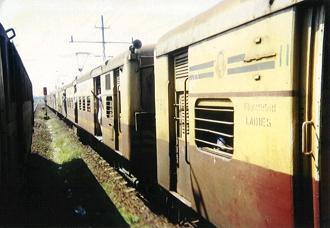 This is realization of another common railfan fantasy - two trains in the same direction, running on adjacent lines! The Nellai Express to Tirunelveli overtakes a Tambaram EMU on the adjacent line. Bad light mars further observation, but you can make out pantographs on adjacent coaches of the EMU. As my luck would have it, I managed to click the "Ladies" section of the coach! |