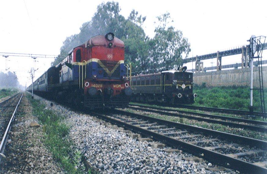 One more prestige crossing in the path of 6010 Chennai Mumbai Mail, its the wait for 2628 New Delhi Bangalore Karnataka Express. The Karnataka Express has one of the longest runs for a double-headed diesel locomotive. Two WDM/2 powers from ET do the honors for this train. This pic is dated June '98 - hence the vaccuum braked maroon liveries for both trains. |