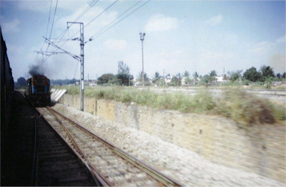 A number of WDM/2 diesel locomotives travel light on the way from Bangalore City station to Krishnarajapuram loco shed. One such Gooty WDM/2 encounters the 2639 Brindavan Express before Bangalore East station. Bangalore City is characterised by sweeping curves on either side and numerous rail overbridges. |
